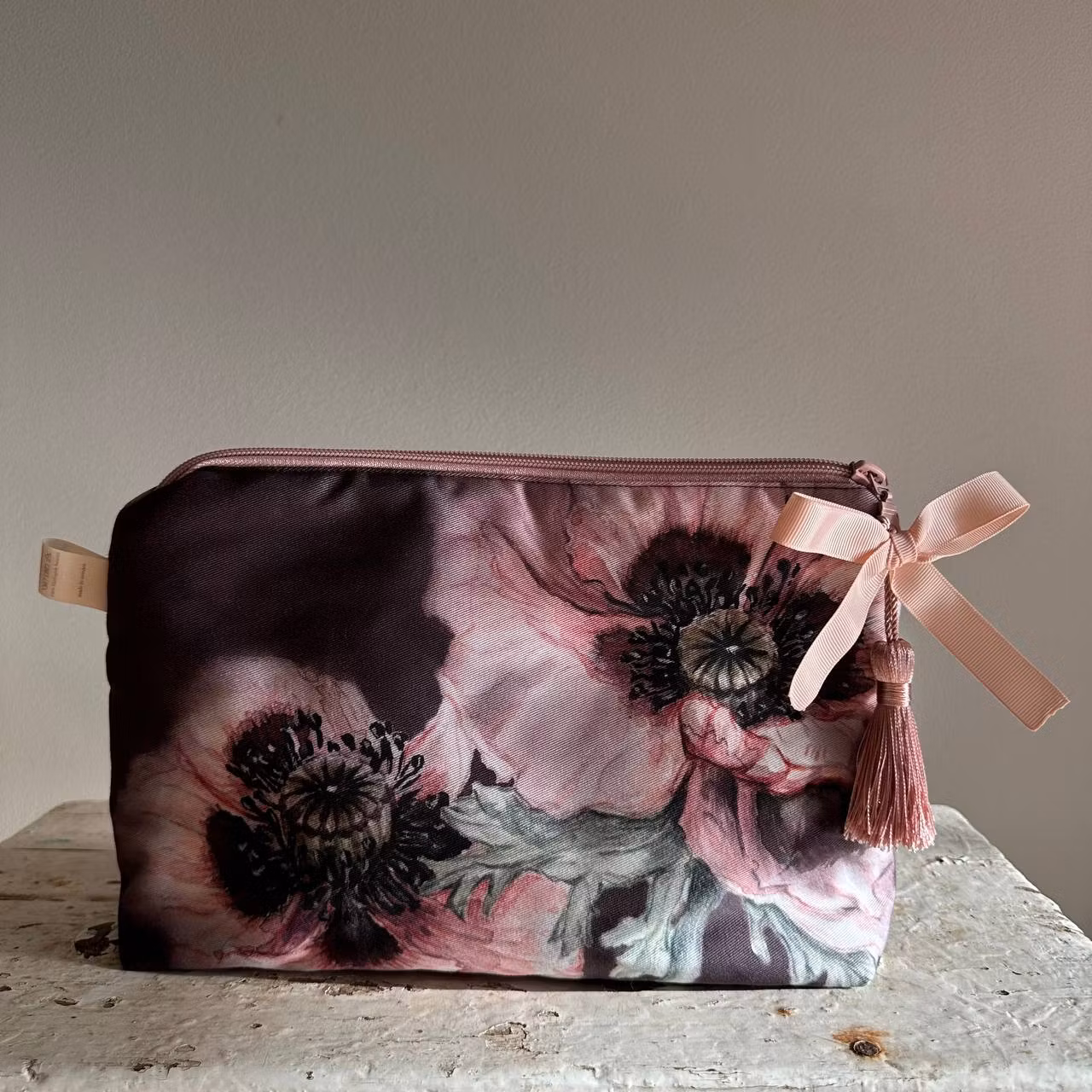 Handgjord necessär i 100 % ekologisk bomull med blommigt motiv – "Rosa Vallmo" av Saga Alavi. Praktisk sminkväska eller resenecessär.